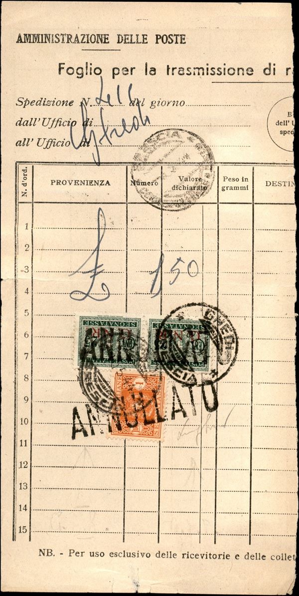 Coppia del 25 cent (50/I) + 1 lira (42 - Regno) in uso misto su ricevuta cumulativa da Ghedi del 10.5.44 - Sirotti