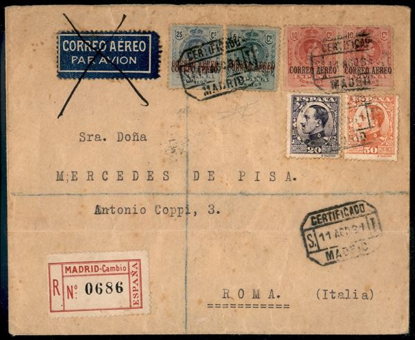 Correo Aereo - 5 cent (250 varietà) con doppia soprastampa + coppia del 10 cent (251) + 25 cent (252 varietà) con doppia soprastampa + complementari (566+570) - raccomandata da Madrid a Roma del 11.8.31 - Raybaudi