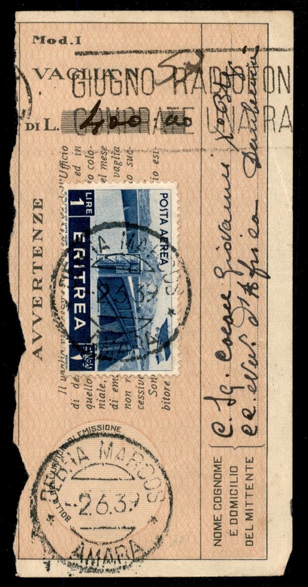 Debra Marcos - 1 lira (21) su ricevuta vaglia del 2.6.39