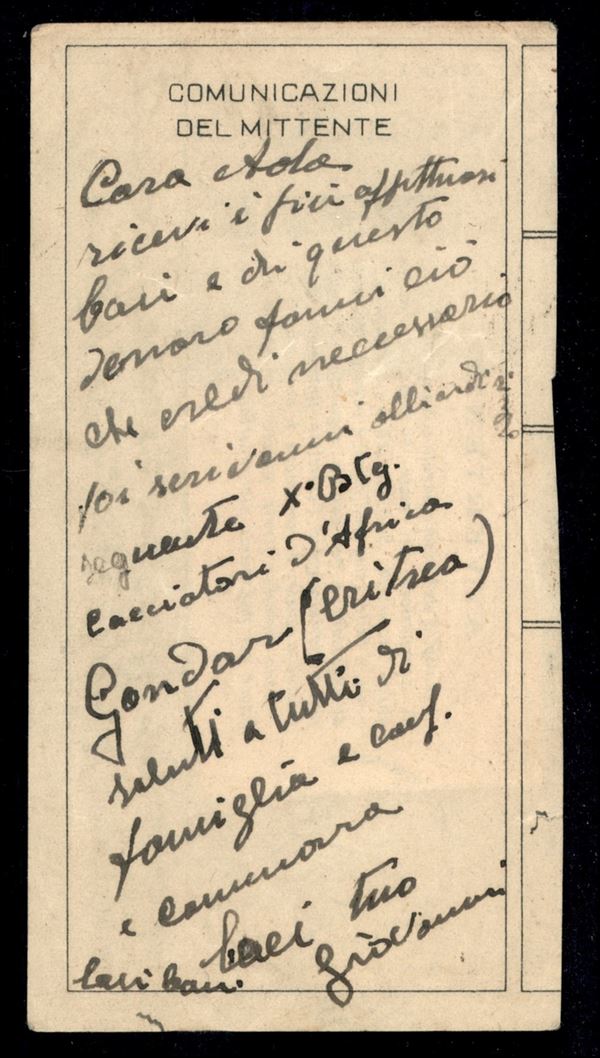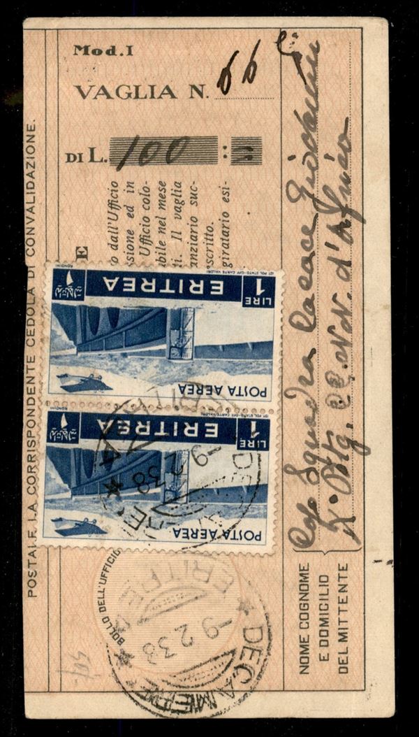 Decamerč - coppia del 1 lira (21) su ricevuta vaglia del 9.2.38