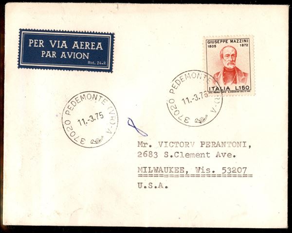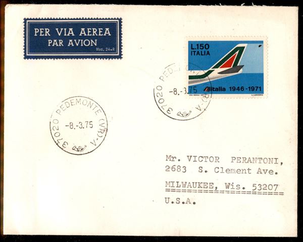 Due aerogrammi in tariffa per gli Stati Uniti affrancati per 150 lire (1157 + 1170) da Pedemonte del 8.3.75 e 11.3.76