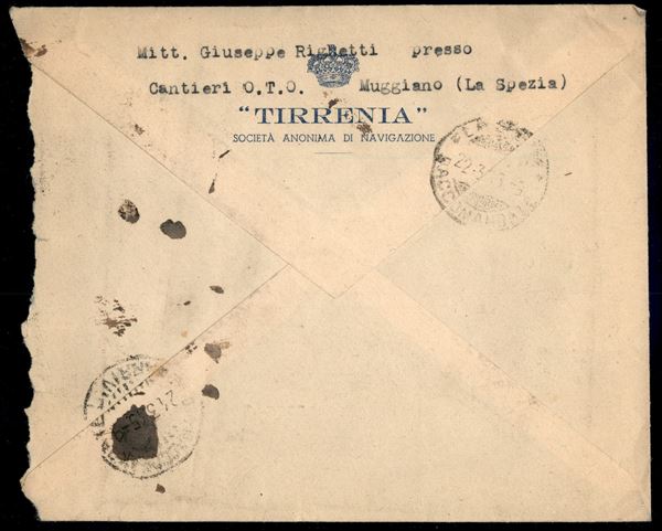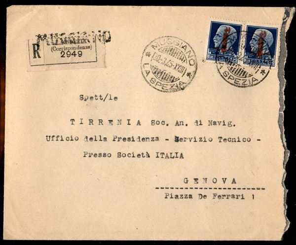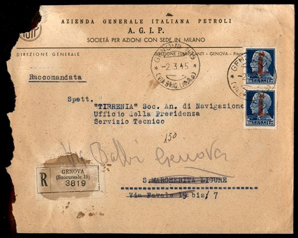 Due raccomandate affrancate con valori del 1.25 lire (495) da Genova e da Muggiano rispettivamente il 2.3.45 e il 20.3.45