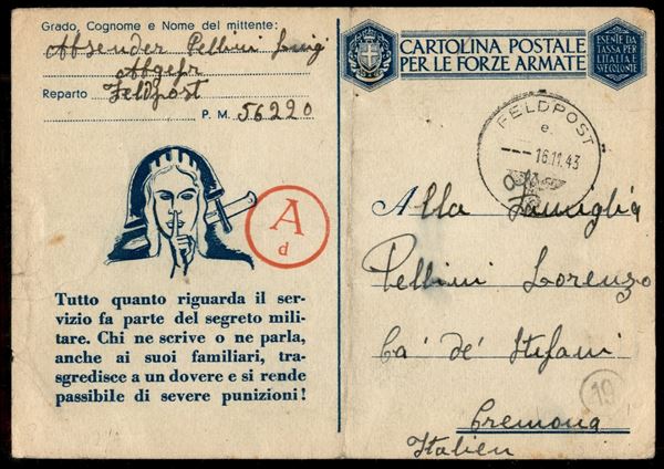 Feldpost e del 16.11.43 con numero 56220 del reparto Festung infanterie regiment 966 da Cefalonia a Cremona - piega centrale - rara