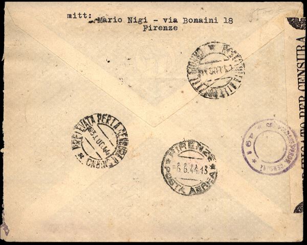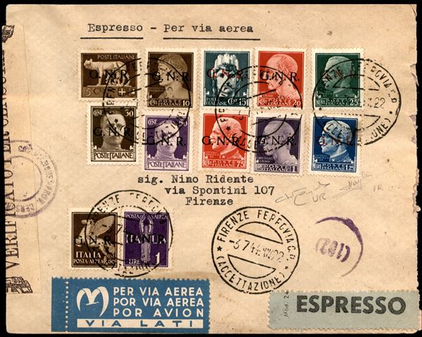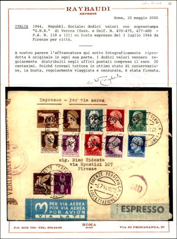 Firenze 3.7.44 - espresso per cittą con tutti i dodici valori (470/475 +477/480+Aerea 118+121) della GNR Verona distribuiti regolarmente e venduti negli Uffici Postali della RSI - cert. Raybaudi