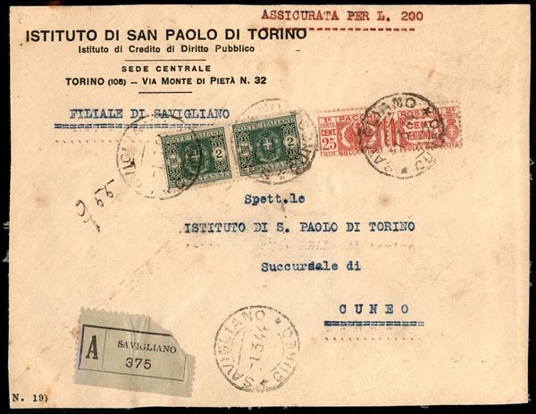 Frontespizio di assicurata da Savigliano a Cuneo del 1.3.44 con affrancatura d'emergenza (Pacchi Postali 26 + Segnatasse 43 coppia)