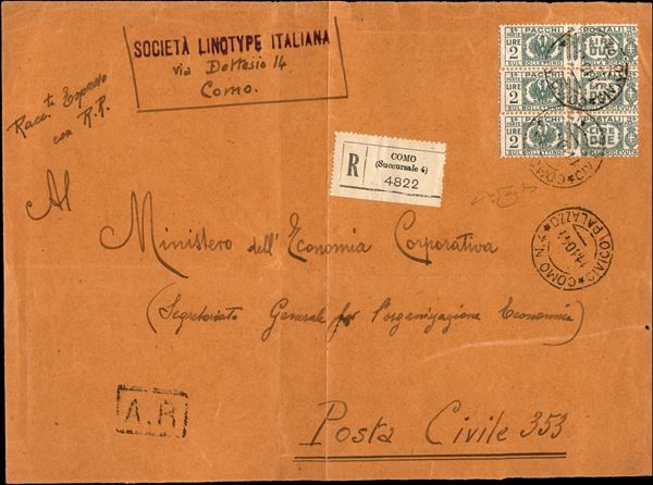 Frontespizio di raccomandata da Como per la Posta Civile 353 con affrancatura d'emergenza (Pacchi Postali 31 striscia di 3) - Raybaudi