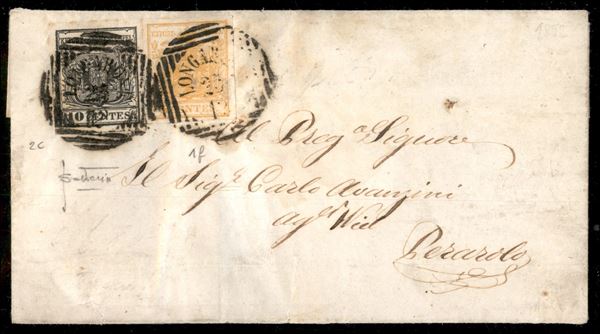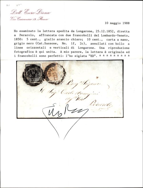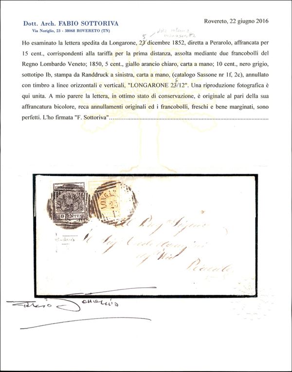 Longarone (P.ti 4) - 10 cent (2c) + 5 cent (1f) - lettera per Perarolo del 23.12.1852 - cert. Sottoriva