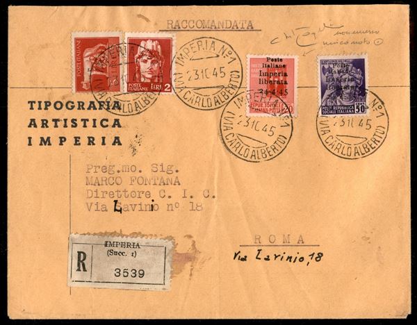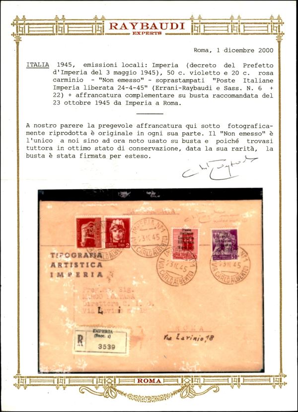 Non Emesso - 20 cent (22) + complementare (6 + Imperiale) - raccomandata per Roma del 23.10.45 - rarissimo insieme (probabilmente unico) - cert oro Raybaudi