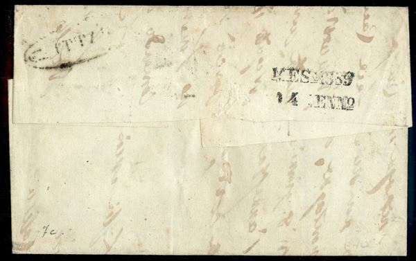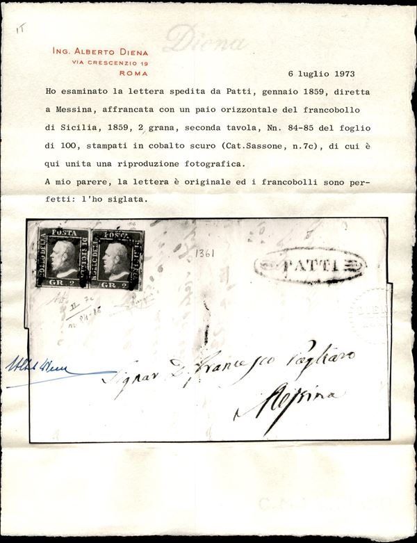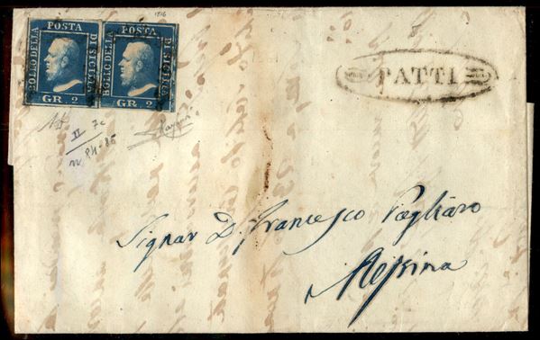 Patti (P.ti 10) - coppia del 2 grana cobalto scuro (7c - posiz. 84/85) su lettera per Messina del 12.1.1859 (primo giorno d'uso) - raro insieme - M. Raybaudi + cert. A. Diena