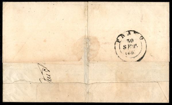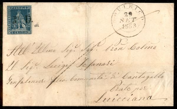 PD di S. Quirico (P.ti 10) unico annullatore di 2 crazie (5a - carta azzurrata) su lettera per Prato del 29.9.1853 - L. Gazzi