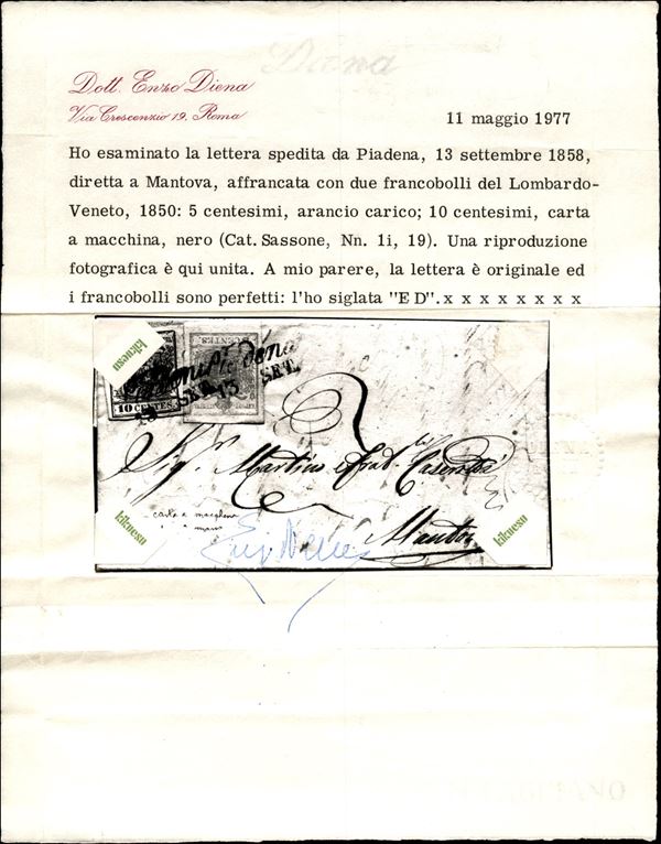 Piadena (P.ti 5) - 10 cent (19) + 5 cent arancio carico (1i) applicati a tete beche su letterina per Mantova del 13.9.1858 - cert. E. Diena