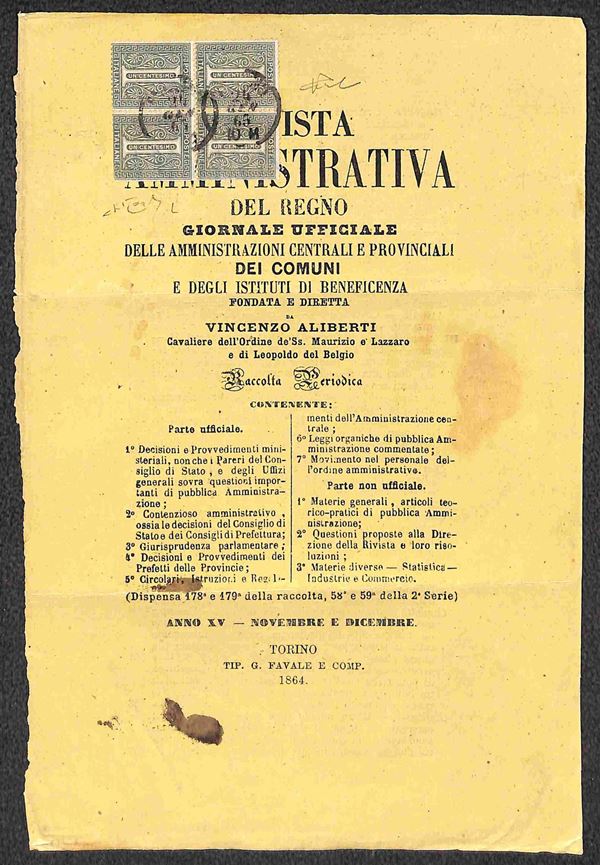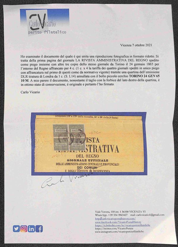 Quartina del 1 cent (L14) su pagina della Rivista Amministrativa - Torino 24.1.65 - Raybaudi + cert. Vicario