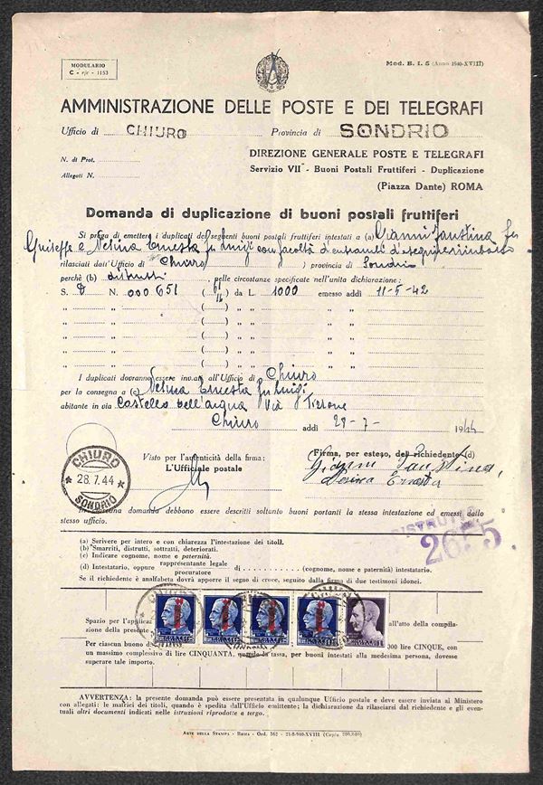 Quattro 1,25 lire (495) + complementare (252A) su intera Domanda di Duplicazione - Chiuro/Sondrio 28.7.44