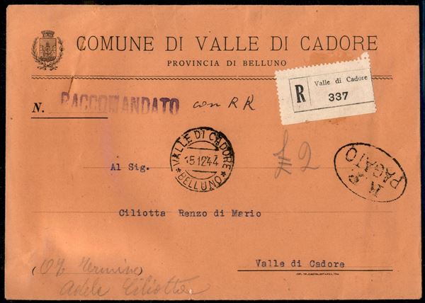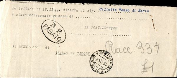 R.P. Pagato - un frammento e una raccomandata da Valle Cadore del 15.12.44