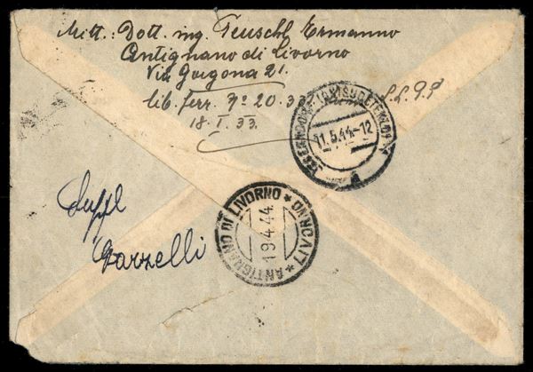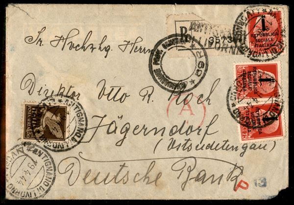 Tre 75 cent (494) + 50 cent P. Aerea (11) su raccomandata da Antignano di Livorno a Jagerndorf del 19.4.44