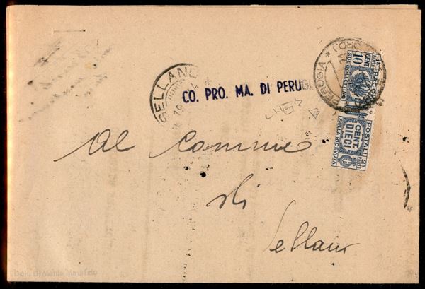 Usi Tardivi - 10 cent Pacchi Postali (25 - Regno) isolato su documento del Consorzio Macellai da Perugia a Sellano del 19.5.44 - Raybaudi + Diena