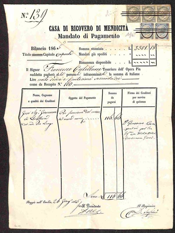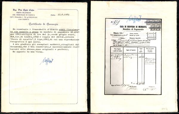 Uso fiscale - Striscia di tre del 5 cent (L16) + coppia del 20 su 15 cent (23) annullati a penna su mandato di pagamento - Reggio Emilia 26.6.65 - cert Caffaz