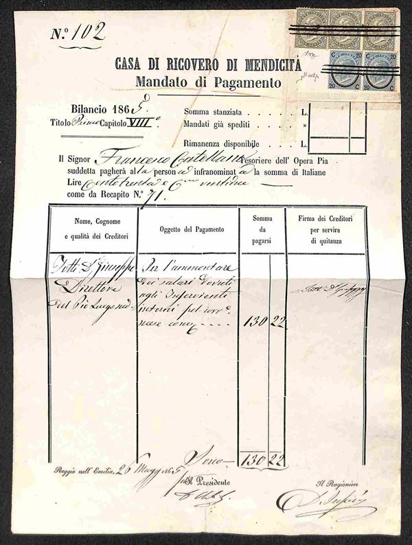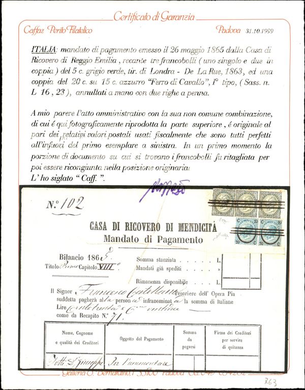 Uso Fiscale - tre 5 cent De La Rue (L16) + coppia del 20 cent su 15 (23) - Mandato di Pagamento da Reggio Emilia del 26.5.65 - cert Caffaz