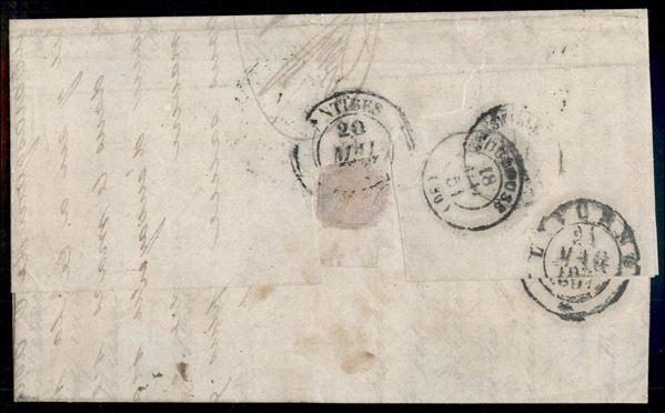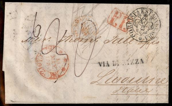 1851 (11 maggio) - Cadiz + PP (entrambi in rosso) - lettera per Livorno via Nizza e Genova - tassata