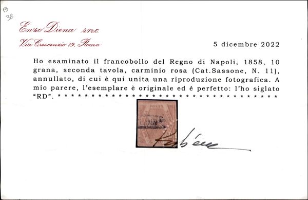 1858 - 10 grana carminio rosa (11) - II Tavola - usato - cert. R. Diena