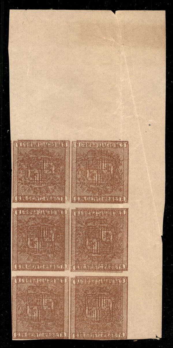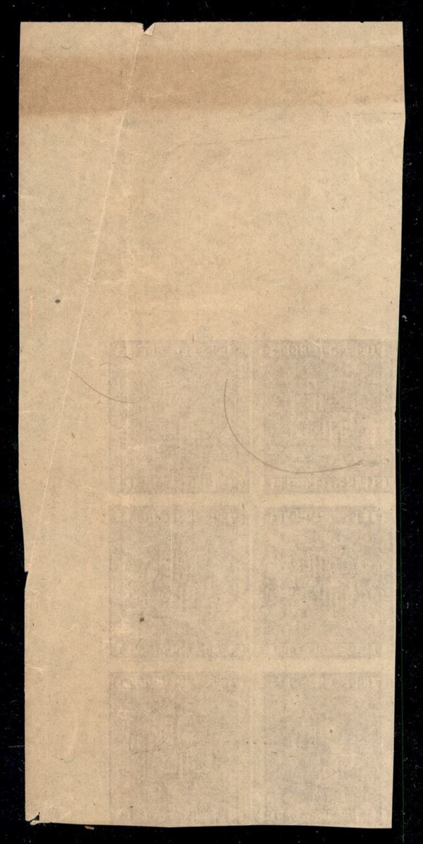 1874 - Blocco di sei del 10 cent (145Bp) - prova con doppia stampa invertita - bordo foglio - senza gomma