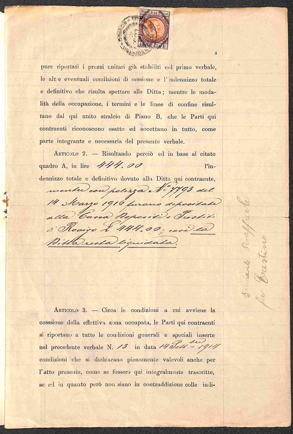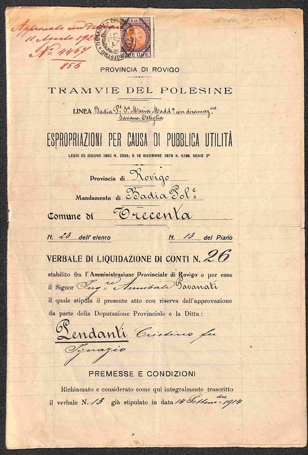 1922 - Documento completo di esproprio per pubblica utilità per le Tramvie del Polesine - Trecenta 13.7.22