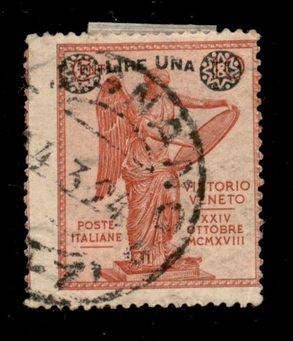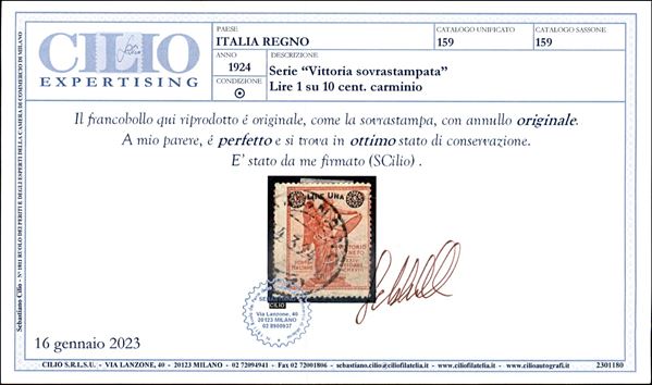 1924 - 1 lira su 10 cent Vittoria (159) usato - cert. Cilio