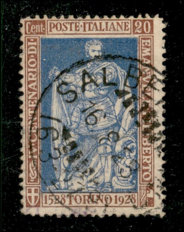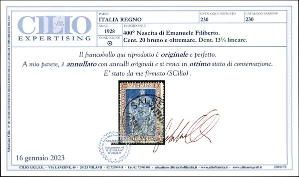 1925 - 20 cent Filiberto (230) dentellato 13 3/4 - usato (qualche dentino carente) - cert. Cilio
