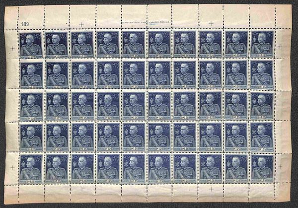 1926 - 1,25 lire Giubileo (188) - intero foglio di 50 con bordi integri e numero di Tavola 189 - gomma integra (750++)