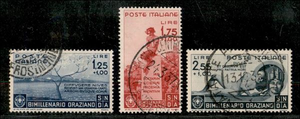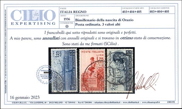 1936 - Orazio - 1,25 lire (403) + 1,75 lire (404) + 2,55 lire (405) - 3 valori usati - Colla + cert. Cilio