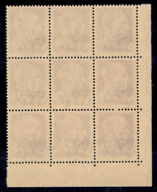 1943 - Blocco di nove del 1 lira (479/I) pos. 71/93 - angolo di foglio - gomma integra