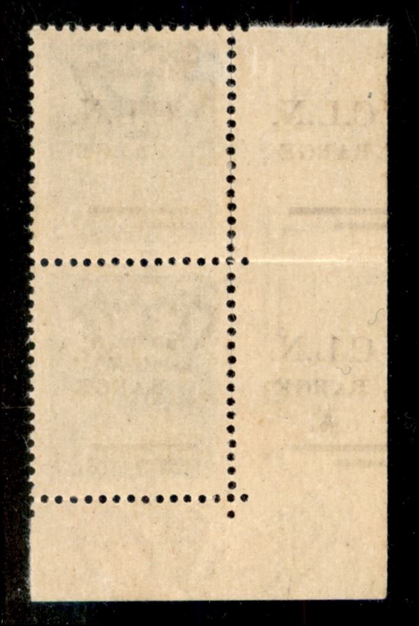 1945 - 25 cent (3 - varietà) - coppia verticale angolo di foglio (pos. 81/91) con soprastampe ripetute a margine - gomma integra - non catalogato - dentellatura aperta in alto - cert. AG