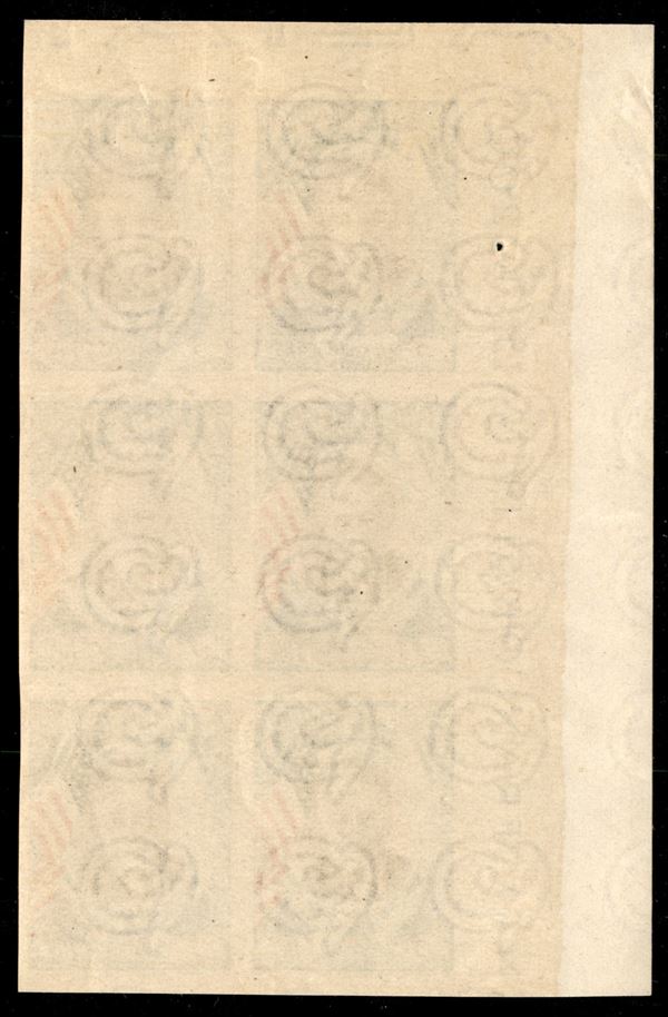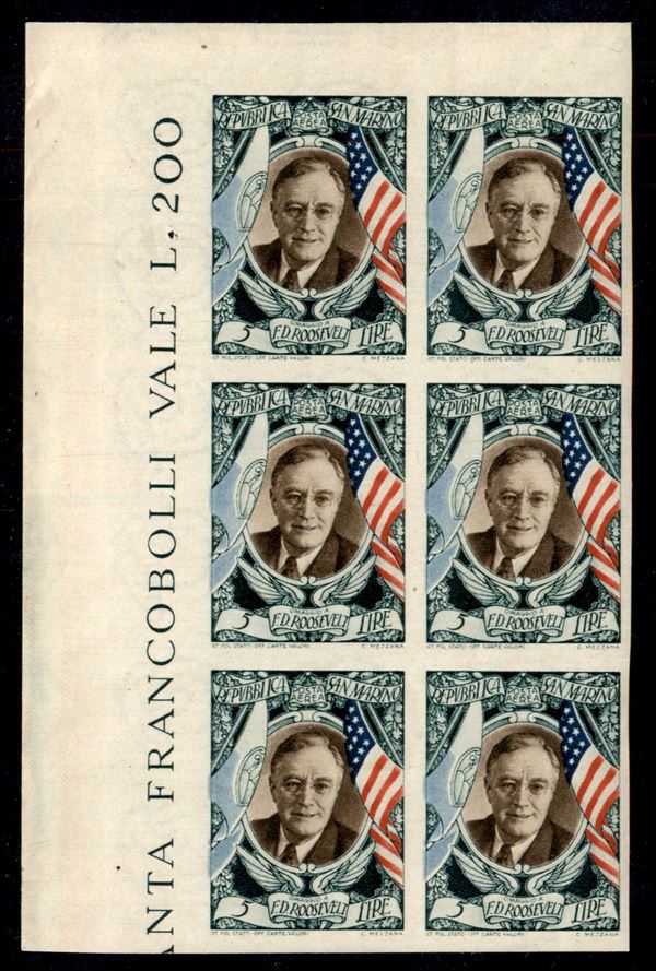 1947 - 5 lire Roosevelt (303b) non dentellato - blocco angolare di 6 - gomma integra