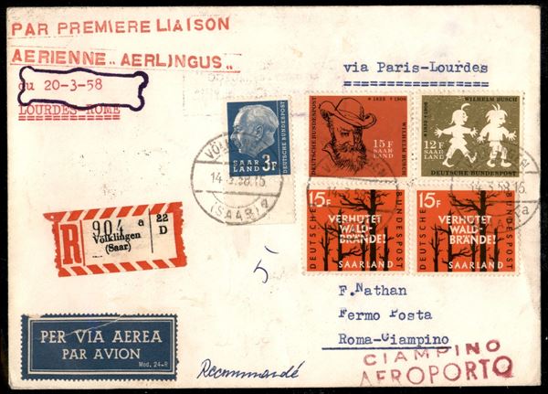 1958 (20 marzo) - Lourdes Roma (Pellegrini 803) - aerogramma raccomandato dalla Saar - 10 volati