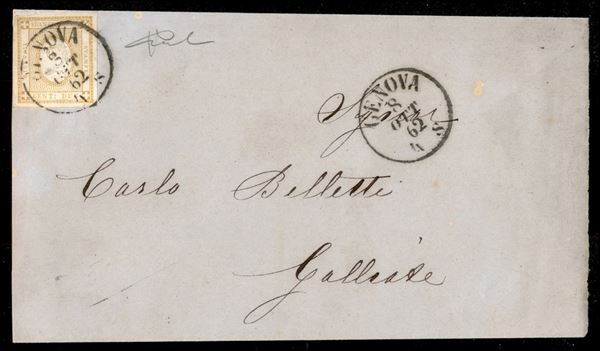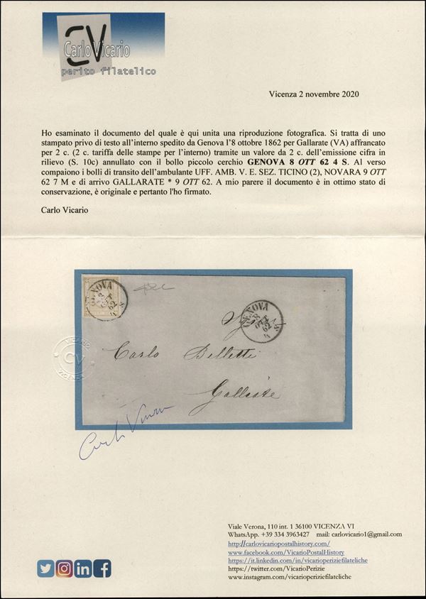 2 cet (10c - giallo) - involucro di lettera da Genova a Gallarate del 8.10.62 - cert. Vicario