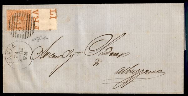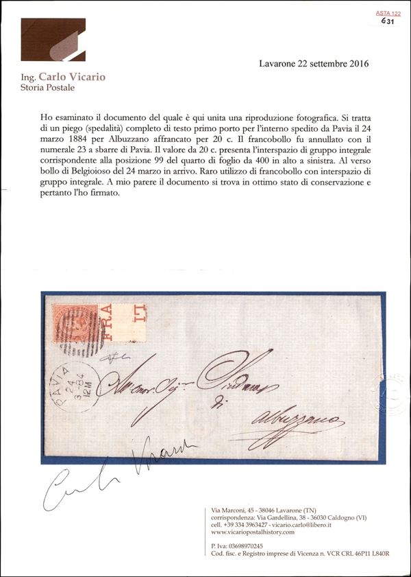 20 cent Umberto (39) con intero interspazio centrale in basso - piego da Pavia a Albuzzano del 24.3.84 - cert. Vicario