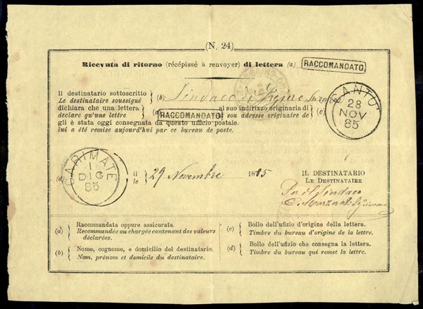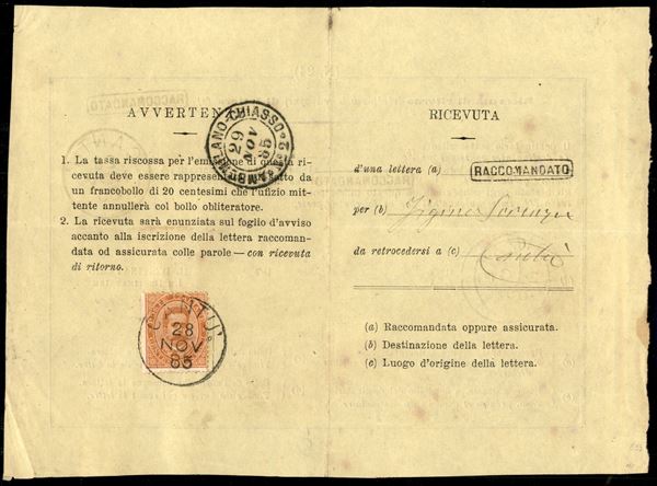 20 cent Umberto (39) su Ricevuta di Ritorno da Cantù a Carimate del 28.11.85 con Amb. Milano Chiasso N. 2