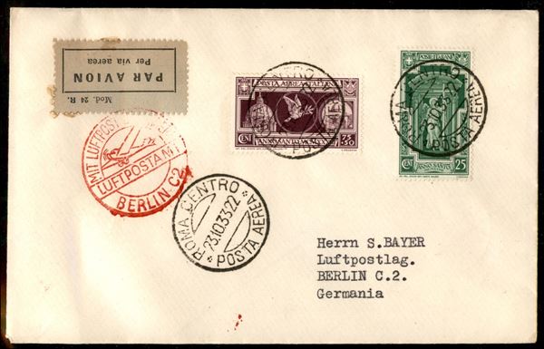 Anno Santo (346 + 55 Aerea) - 2 valori su aerogramma FDC (23 ottobre 1933) da Roma a Berlino nel giorno d'emissione