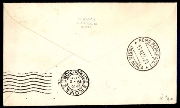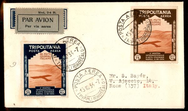 Arte Coloniale (41 + 43 - Aerea) - 2 valori usati su aerogramma FDC da Tripoli a Roma il giorno precedente l'emissione (15.10.34)