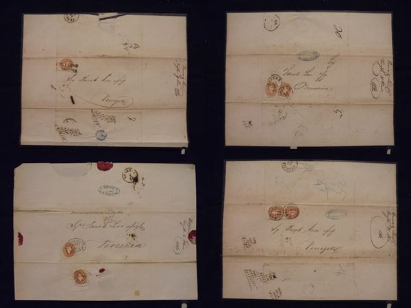 AUSTRIA - Quattro lettere d’archivio del 1861 da Trieste a Venezia col 10 kreuzer (21) - due con doppia affrancatura (una raccomandata) - un pezzo con linee di colore da bordo foglio - bell’insieme