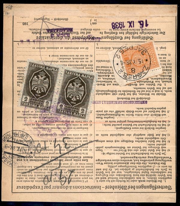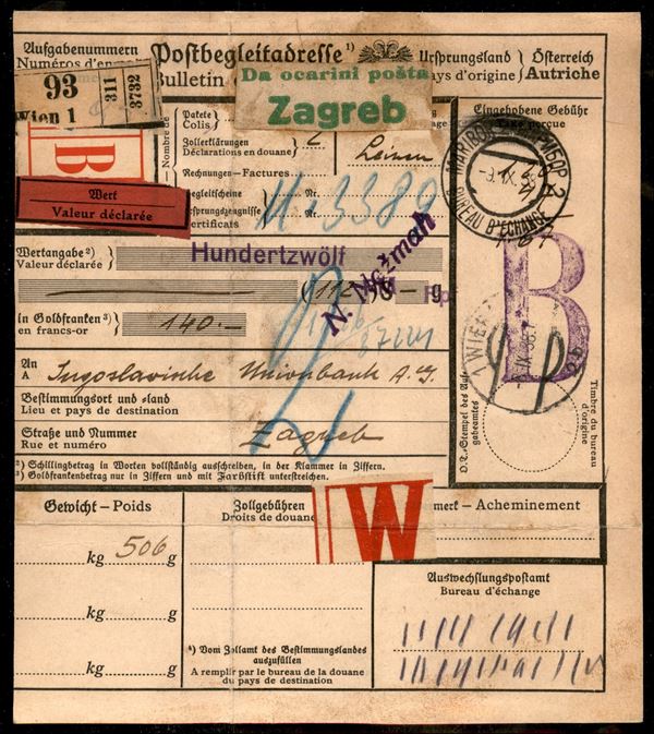 Bollettino da Vienna a Zagabria (via Maribor) del 8.9.1938 per 140 franchi oro
