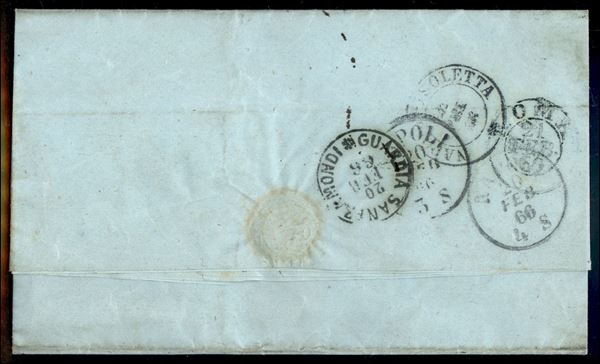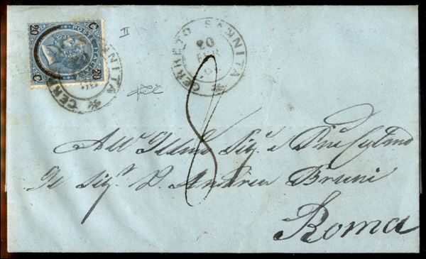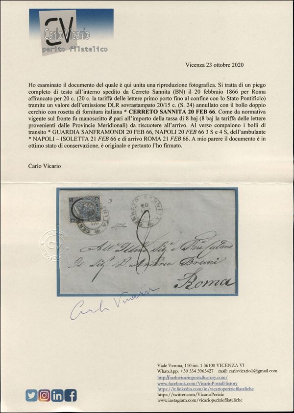 Cerreto Sannita (P.ti 5) - 20 cent su 15 (24 - Regno) su lettera per Roma del 20.2.66 tassata per 8 bai - al retro transiti di Guardia Sanframondi + Isoletta Napoli - cert. Vicario