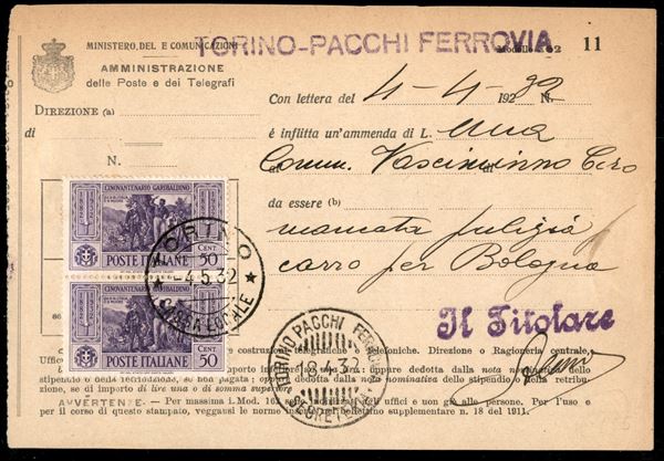 Coppia del 50 cent Garibaldi (319) su Modulo Amministrativo (multa per mancata pulizia) - Torino 4.5.32