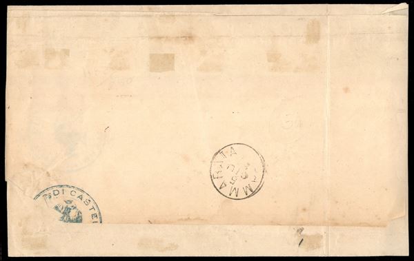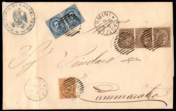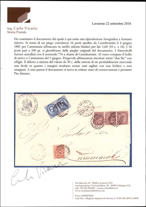 Due Re - striscia di tre del 30 cent Torino (19) difettosa (strappata a destra) + Umberto (36 + 40 coppia) - piego da Castel Termini a Cammarata del 4.6.81 - cert. Chiavarello + Vicario