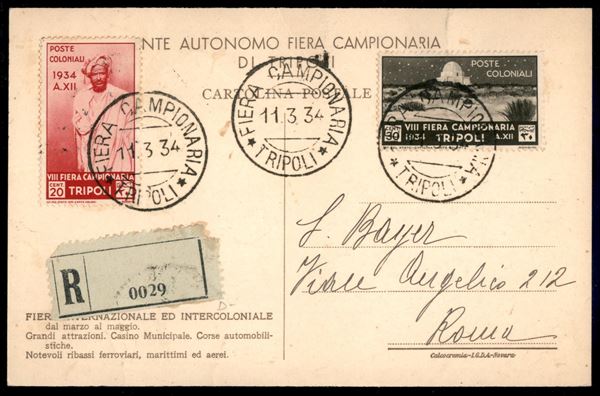 Fiera Campionaria (126 + 128 + 130) - 3 valori su cartolina raccomandata da Tripoli a Roma del 11.3.1934