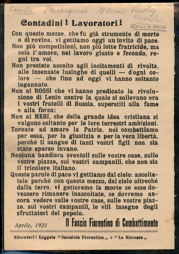 Firenze 1921 (aprile) - Il Fascio Fiorentino di Combattimento - volantino di propaganda lanciato sulla cittą