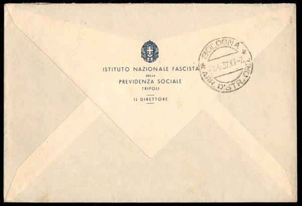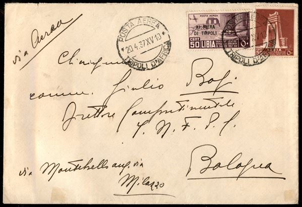 Gemelli - 50 cent Litoranea (140) + 50 cent XI Fiera (32 - Aerea) - aerogramma da Tripoli a Bologna del 20.4.37 (420)