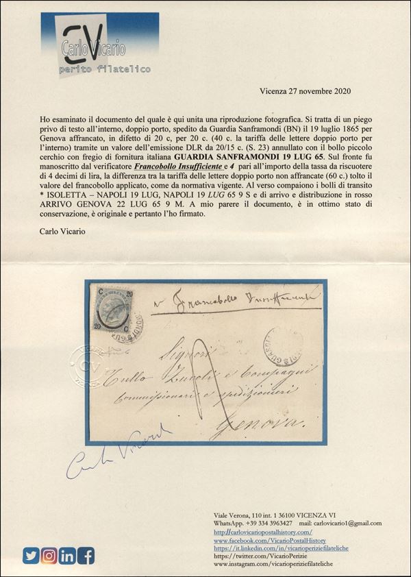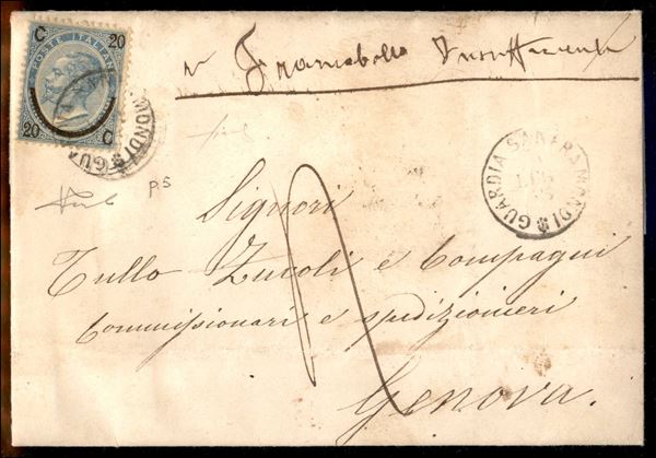 Guardia Sanframonfi (P.ti 5) - 20 cent su 15 (23 - Regno) - lettera per Genova del 19.7.65 - tassata - Fiecchi + cert. Vicario