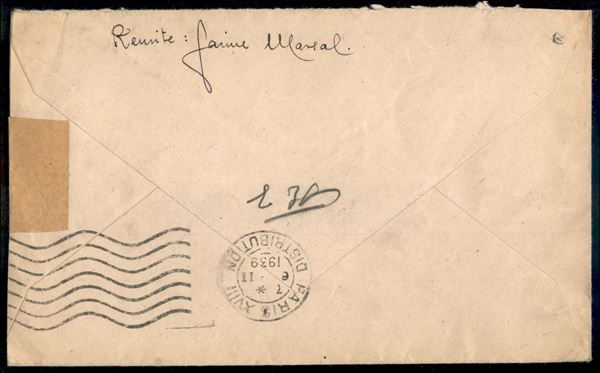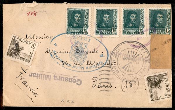 Guerra Civile - 1° Bandiera De Cai/De F.E.T. Y Be Las J.O.N.S. - busta affrancata (766 due + 791 quattro) da Irun a Parigi arrivata il 6.2.39 - censura