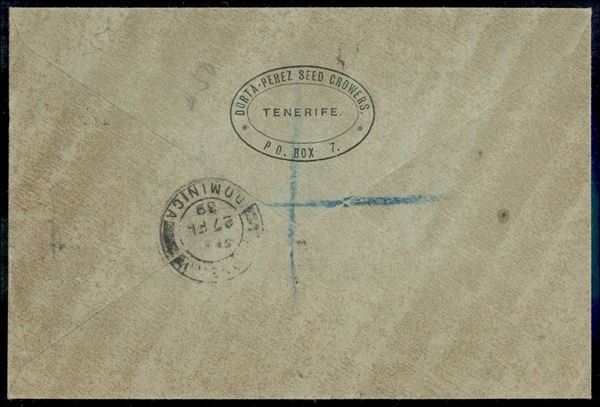 Guerra Civile - 19 Censura Militar Santa Cruz de Tenerife (rosso) - busta raccomandata per Dominica Via Inglaterra (rosso) del 11.1.39 affrancata per 1,40 pesetas